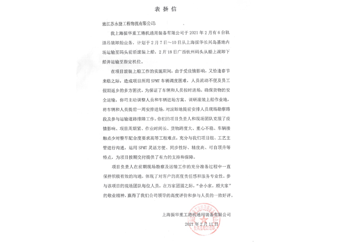 此次项目作业受疫情影响,又恰逢春节期间,但依旧克服了种种困难。项目前期各部门集中力量,组织召开会议,确保运输工程进度与质量,缜密计划实施,提前去现场路勘并进行距离5KM的道路排障,后期比预期提前5天结束,使项目顺利圆满完成。此项目受到了客户单位的高度认可,并发来了表扬信。客户的满意与表扬,就是给我们最好的新年慰问,你们的“坚守”让我们感受到不同温情的“年味”,是激动、是感动、也是我们浓浓的团队凝聚力之深情!