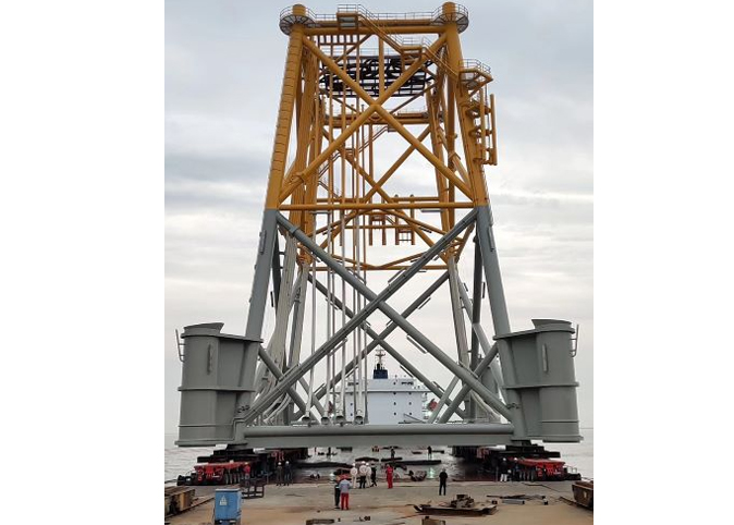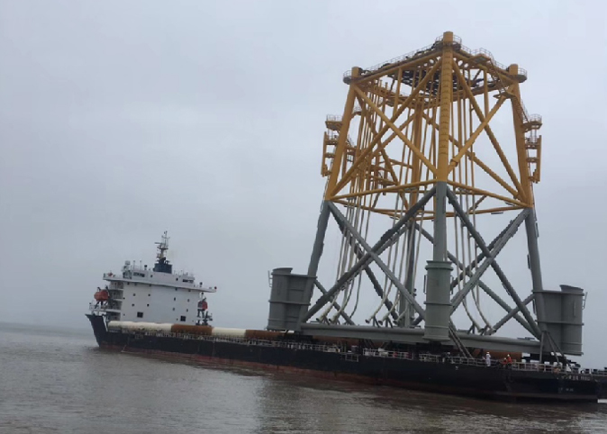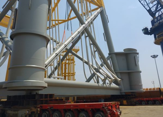 项目特点: 国内结构最大的四桩升压站基础,设备重心高,车辆只能布置在四点,需设计支撑托架。为满足海上浮吊作业,导管架的布置需准确。落位需精确。
