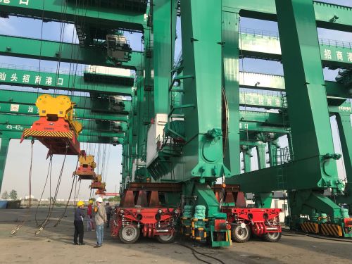 为确保滚装作业的顺利进行,我司技术团队制定了严谨周密的运输方案,在技术设备及专业人员的协作下,经SPMT(自行式模块运输车)滚装作业,将18台轨道吊按期装船发运,在运抵汕头后滚卸下船。