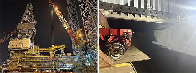 晚上项目现场灯火通明,悬臂梁&钻井包回装进入关键时刻,SPMT轴线车距离已至台阶极限位置,整个回装过程对SPMT轴线车的各项技术指标、全体作业人员的操作技能都是非常严峻的考验。团队所有人抖擞精神,各司其职,实时监测各压力情况适时调整,仅用约2小时完美地完成了悬臂梁&钻井包整体回装。
