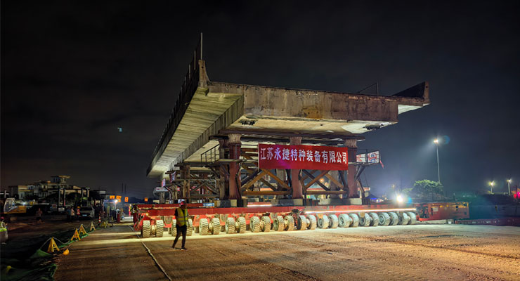 面对时间紧迫、技术复杂、风险系数高及社会关注度高等多重挑战,永捷装备团队科学研判、精准施策。晚上21时30分,4组SPMT模块车精准驶入桥梁下指定位置,通过液压系统同步顶升梁体,至凌晨1时45分左右,梁体顺利落位存梁场落梁工装上。整体作业过程如拆积木一般,精准高效、安全有序、绿色环保。