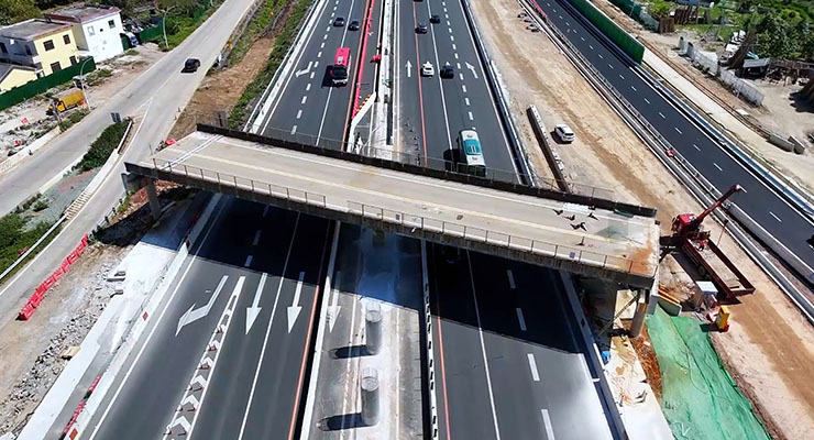 浪网跨线桥主桥为27+27预应力混凝土现浇箱梁,桥宽12米、梁高1.3米。这是广东省高速公路首个应用4组SPMT模块车两跨整体拆除的最长梁体,从进车就位到梁板运离全过程仅用4小时左右,比传统爆破方法节约至少75%的时间,最大限度降低对社会交通的影响。
